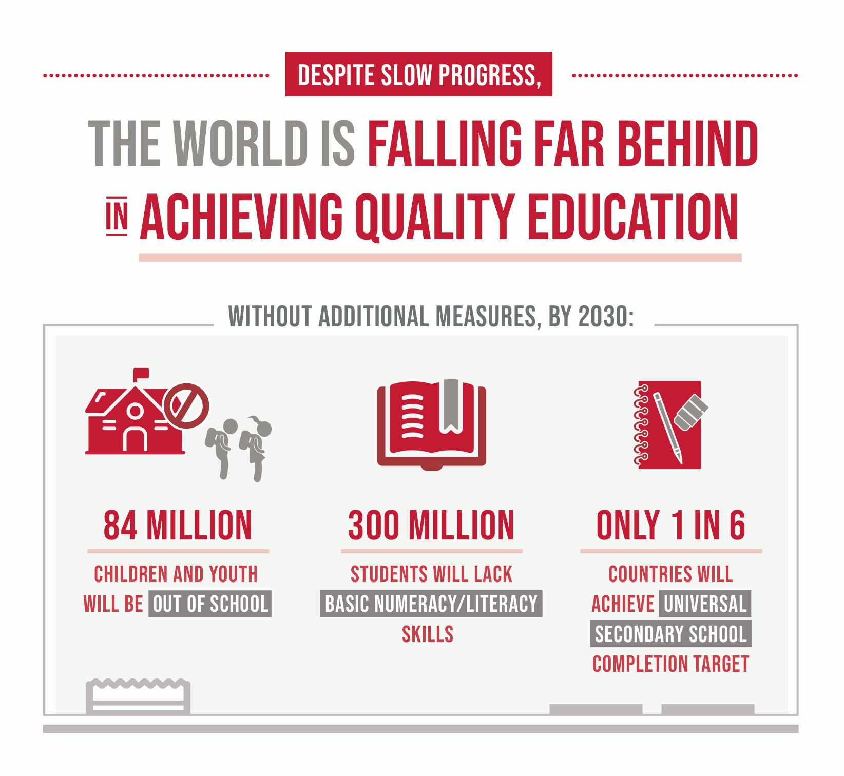 追加の対策がなければ 2030年までに推定8400万人の子供と若者が学校教育を受けられない状態が続くと見られ 約3億人の生徒が生活していくのに必要な基本的な計算力と読み書き能力を欠くことになるでしょう